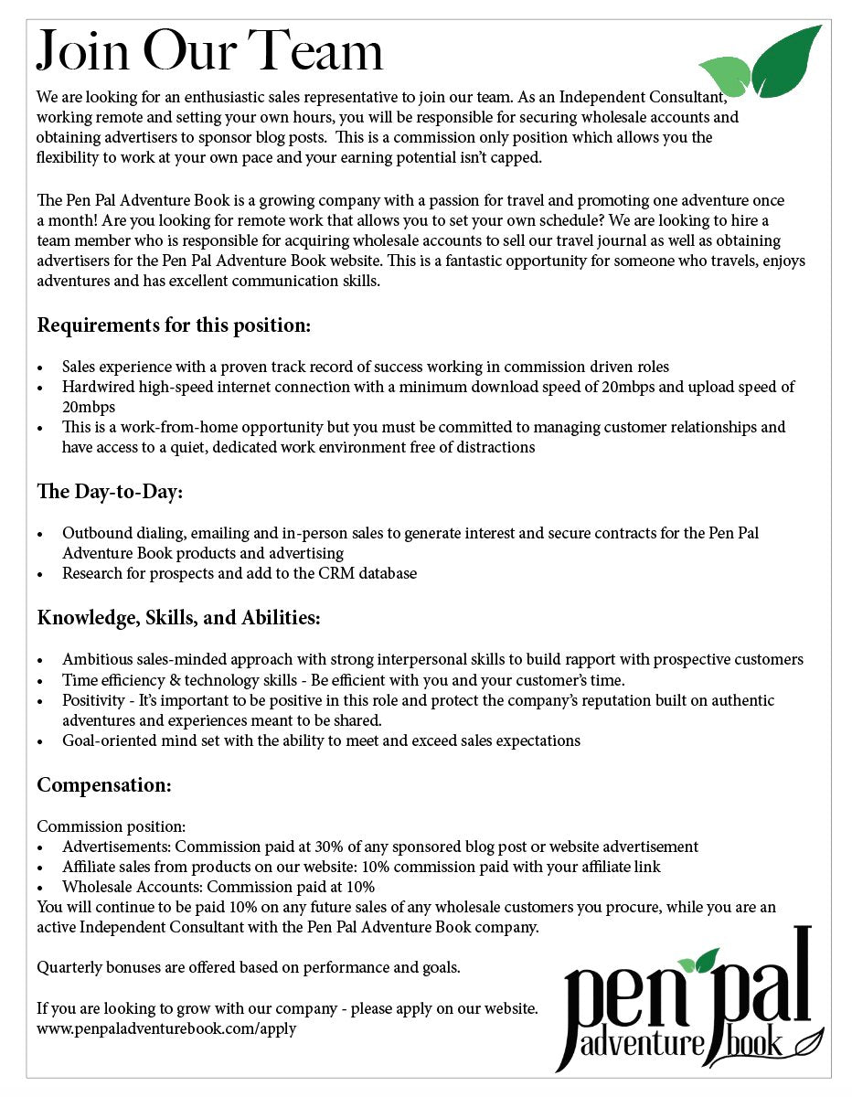 The Pen Pal Adventure Book is a growing company with a passion for travel and promoting one adventure once a month! Are you looking for remote work that allows you to set your own schedule? We are looking to hire a team member who is responsible for aquiring wholesale accounts to sell our travel journal as well as obtaining advertisers for the Pen Pal Adventure Book website. This is a fantastic opportunity for someone who travels, enjoys adventures and has excellent communication skills.